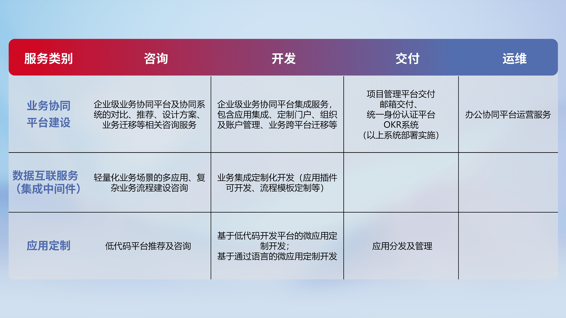 针对钉钉、、、企微、、、、IDaas等平台级产品提供产品的规划、、方案、、、交付、、、定制化开发等服务,,,,实现如统一协同办公、、智能客户服务、、、、混合会议管理、、智能数据查询、、、等业务场景,,,,实现数字化转型。。。。